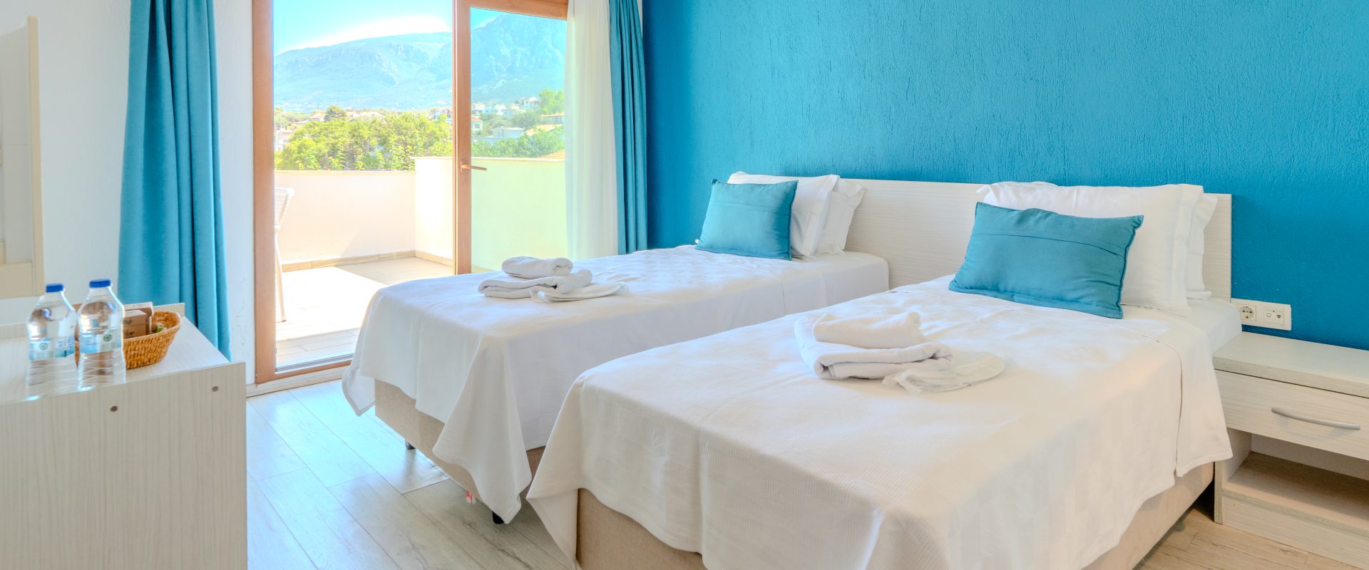 Standart Bahçe Manzaralı Duble Odalar bir ve ikinci katlarda olup, bahçeye (doğuya) bakan manzaralı odalardır. 18m2 Genişliğindeki bu odalarda yataklar 160×200 ebadında rahat ve konforludur.