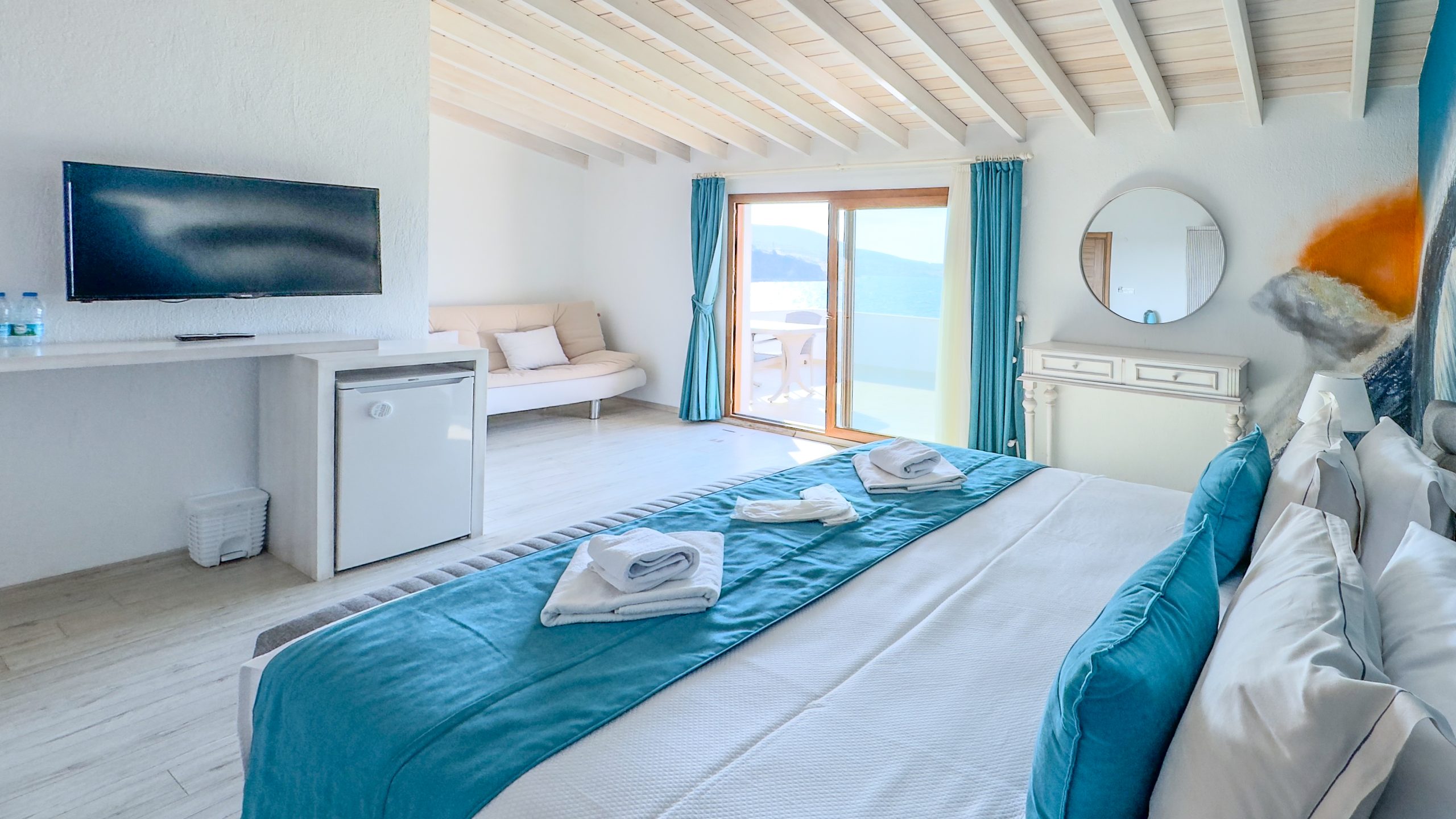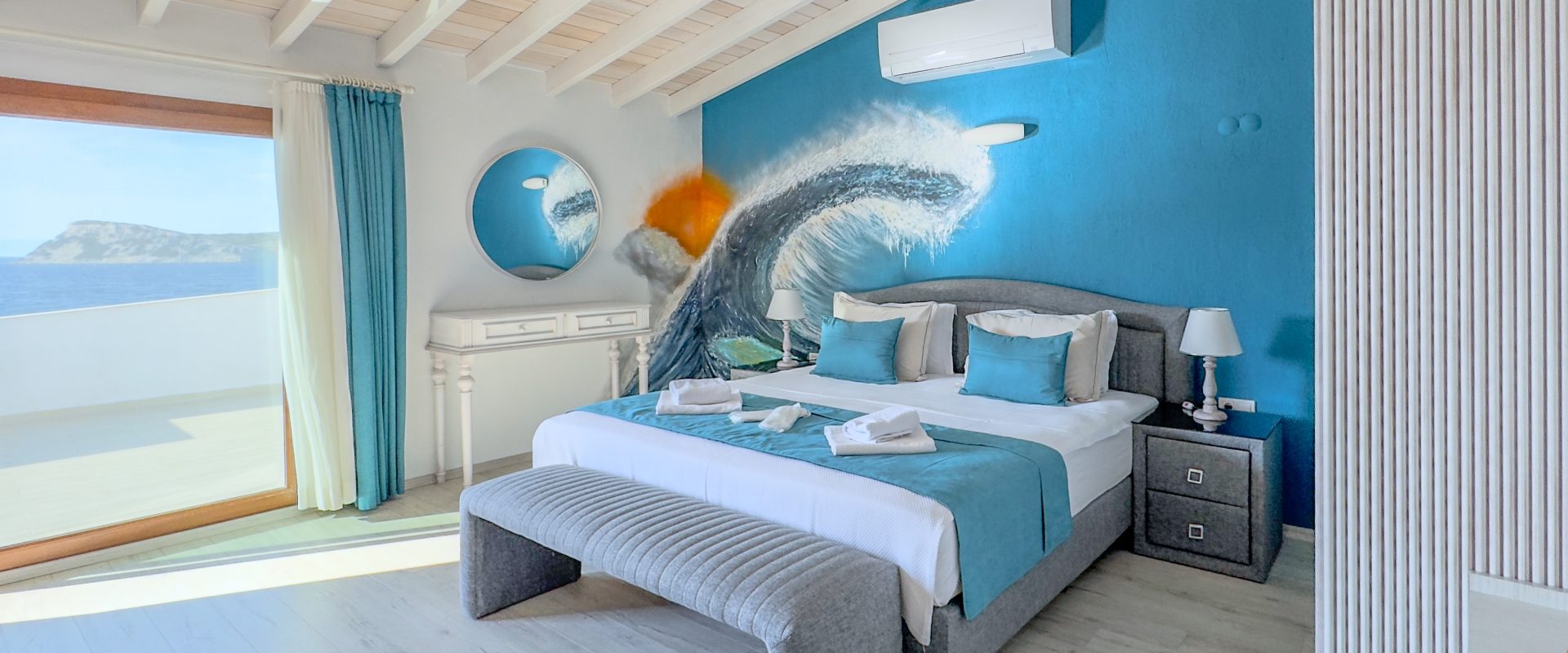 Deluxe Suit Deniz Manzaralı ikinci katta olup, denize (batıya) bakan manzaralı odalardır. Odamız 40 m² genişliğinde olup size özel ayrıca 30m² teras alanı bulunmaktadır. Bu odamızda yataklar 200×200 ebadında ultra rahat ve konforludur.